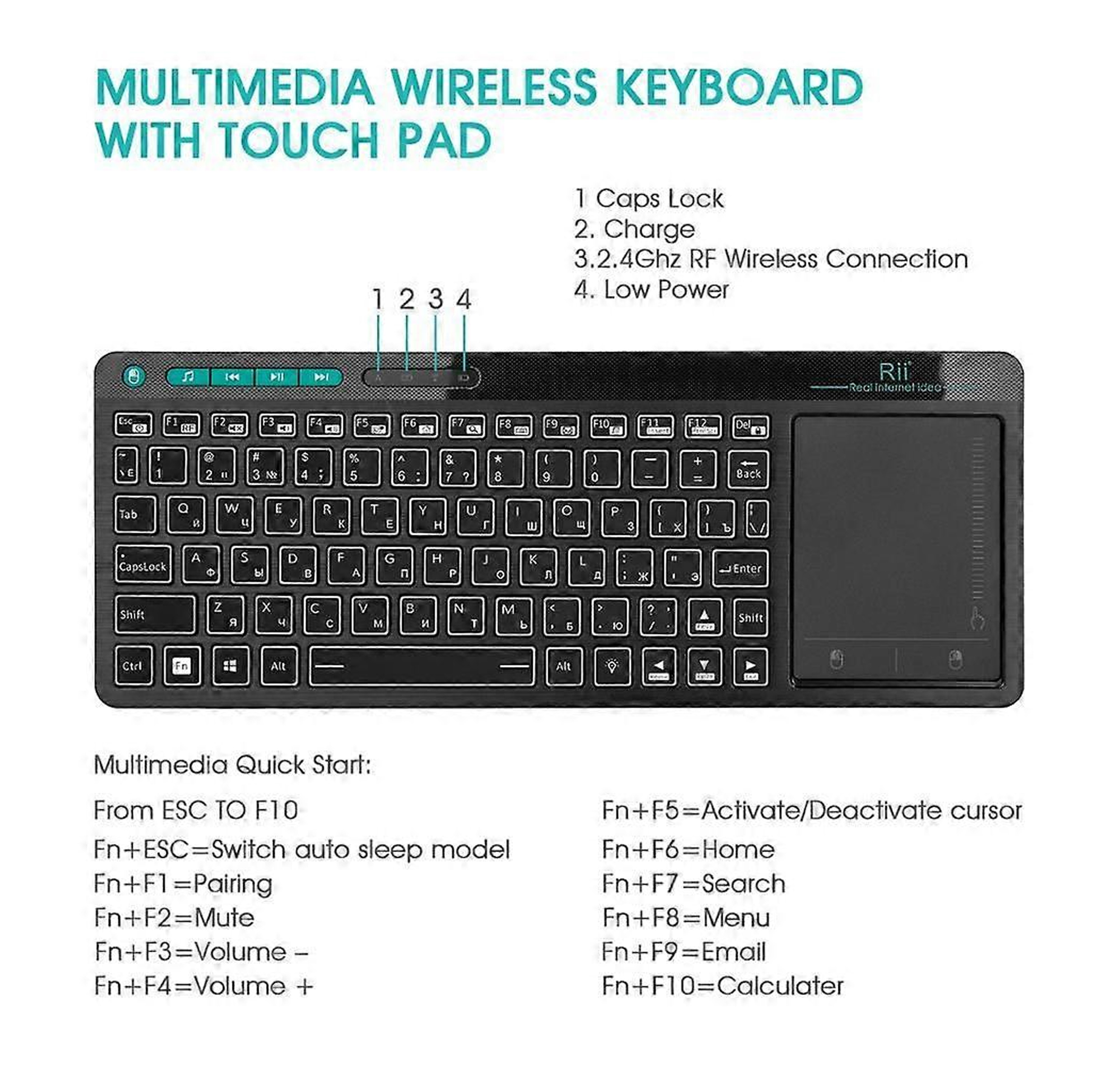 Clavier Rii K18S avec Souris Tactile, (AZERTY), Sans Fil (Bluetooth & 2.4 GHz), Batterie Li-ION,